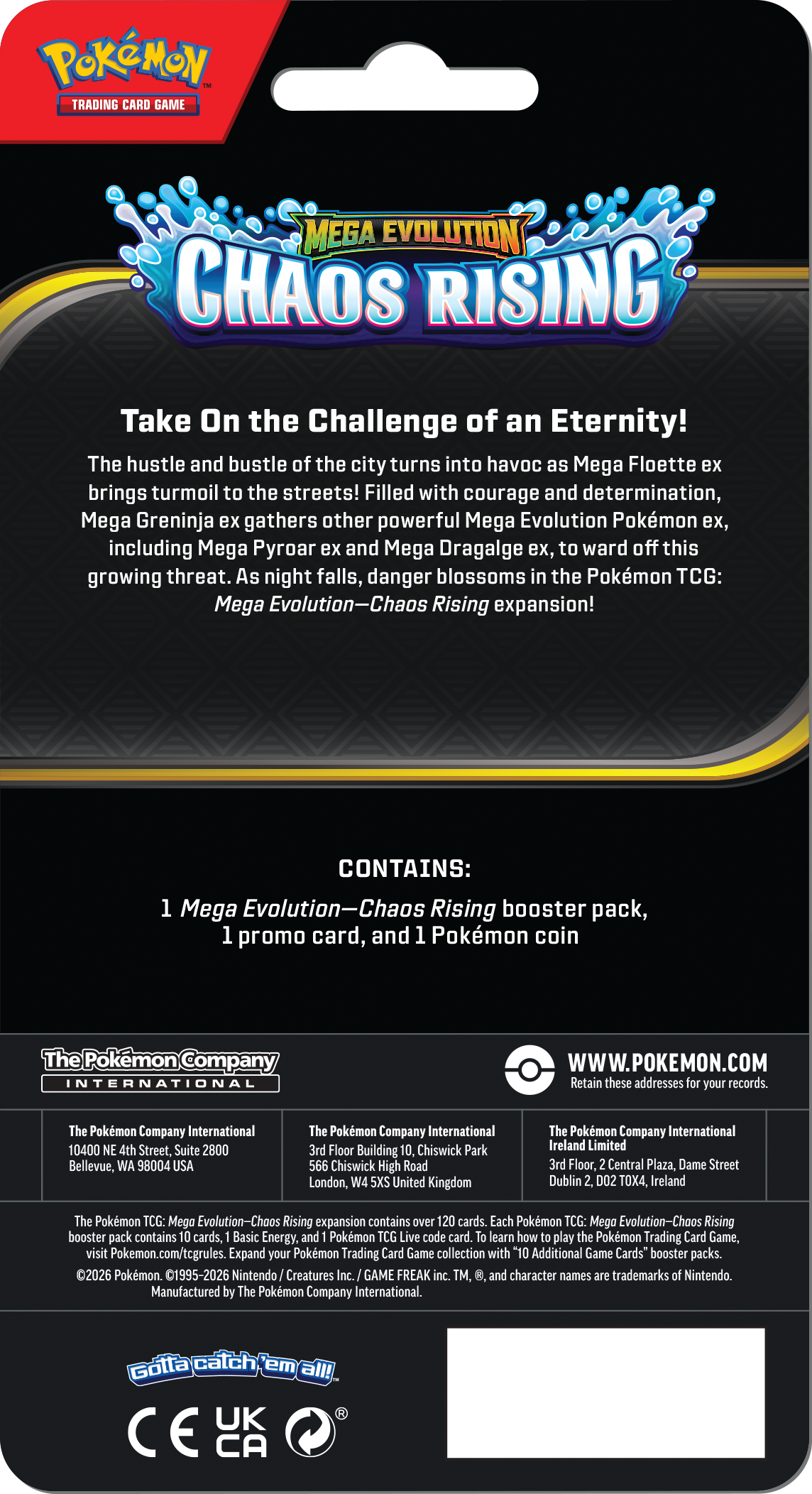 De stad raakt in chaos als Mega Floette ex de straten op stelten zet. Vol moed en vastberadenheid verzamelt Mega Greninja ex een team van krachtige Mega Evolution Pokémon ex — waaronder Mega Pyroar ex en Mega Dragalge ex — om het dreigende gevaar het hoofd te bieden. Als de nacht valt, ontvouwt zich een ongekende uitdaging in de Pokémon TCG: Mega Evolution — Chaos Rising
