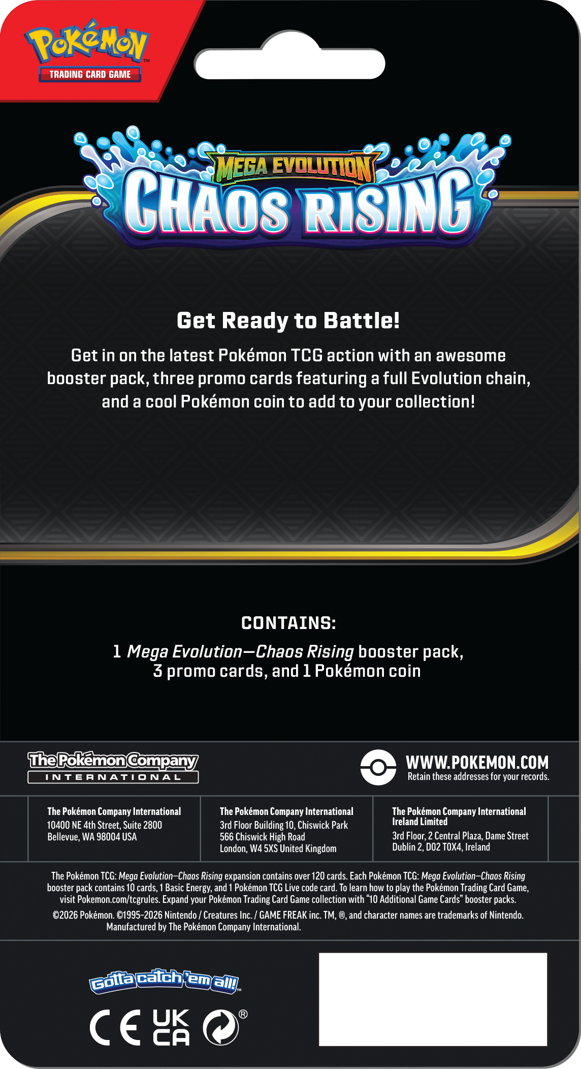 De stad raakt in chaos als Mega Floette ex de straten op stelten zet. Vol moed en vastberadenheid verzamelt Mega Greninja ex een team van krachtige Mega Evolution Pokémon ex — waaronder Mega Pyroar ex en Mega Dragalge ex — om het dreigende gevaar het hoofd te bieden. Als de nacht valt, ontvouwt zich een ongekende uitdaging in de Pokémon TCG: Mega Evolution — Chaos Rising