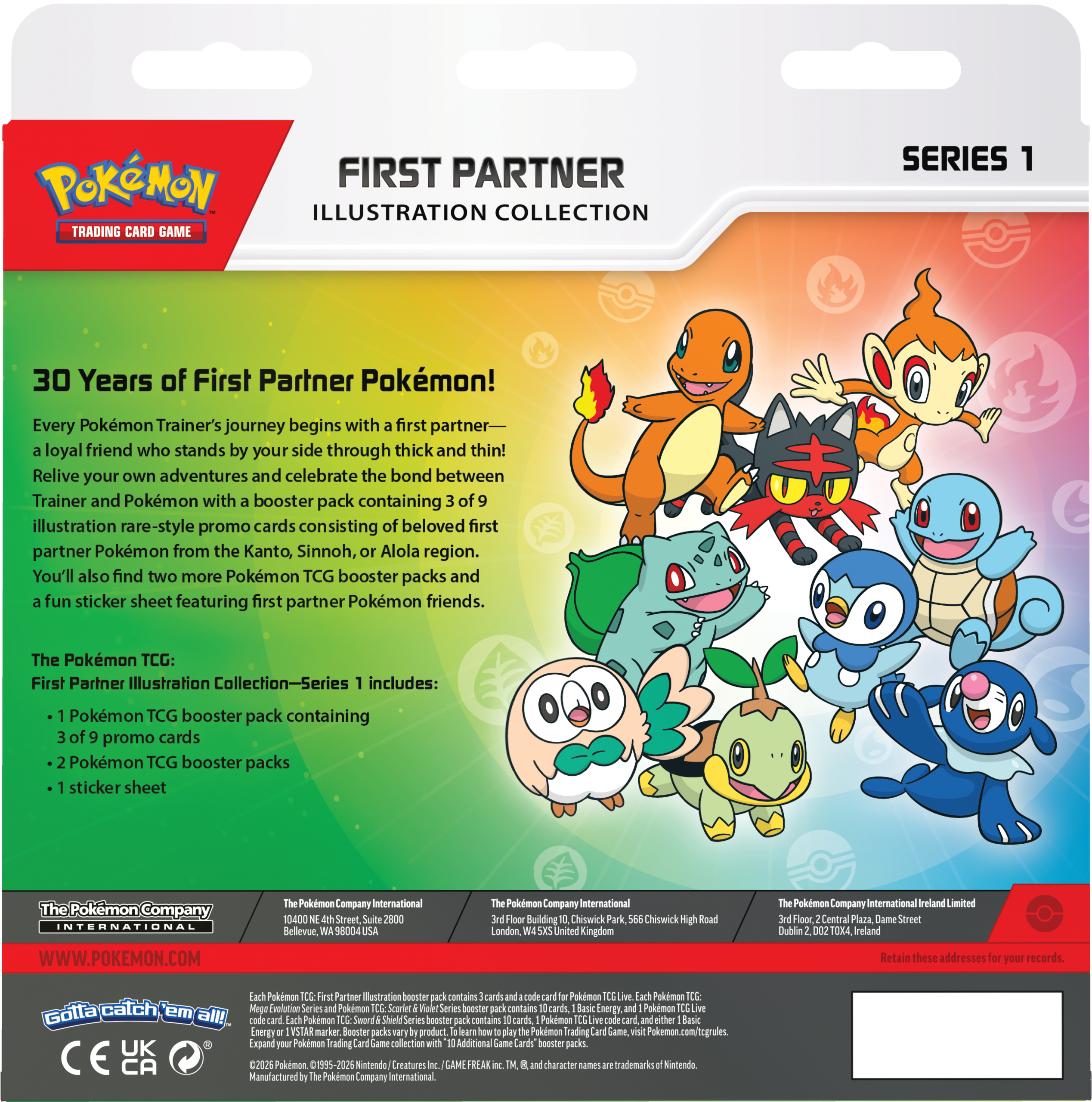 Om het 30-jarig jubileum van Pokémon te vieren, wordt er in 2026 een serie “First Partner Illustration Collections” uitgebracht, te beginnen met serie 1 in maart. Serie 1 bevat de Starter Pokémon uit Kanto, Sinnoh en Alola. In de Pokémon TCG: First Partner Illustration Collection Box