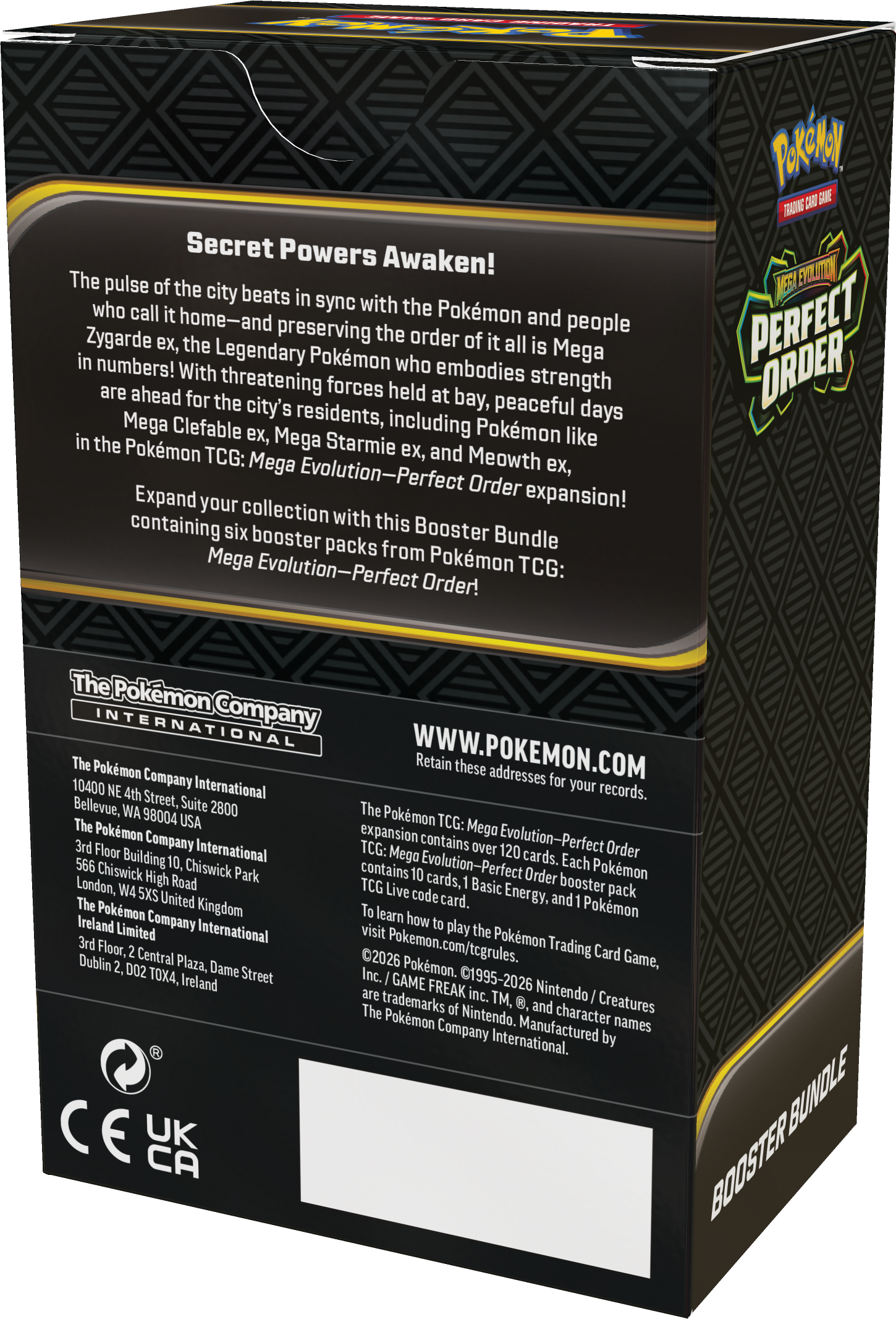 De hartslag van de stad klopt in harmonie met de Pokémon en de mensen die er wonen. De orde wordt bewaard door Mega Zygarde ex, de Legendarische Pokémon die de kracht van aantallen belichaamt! Nu de dreigende krachten op afstand worden gehouden, breekt er een vredige toekomst aan voor de inwoners van de stad, waaronder Pokémon zoals Mega Clefable ex, Mega Starmie ex en Meowth ex, in de Pokémon TCG: Mega Evolution—Perfect Order-uitbreiding!