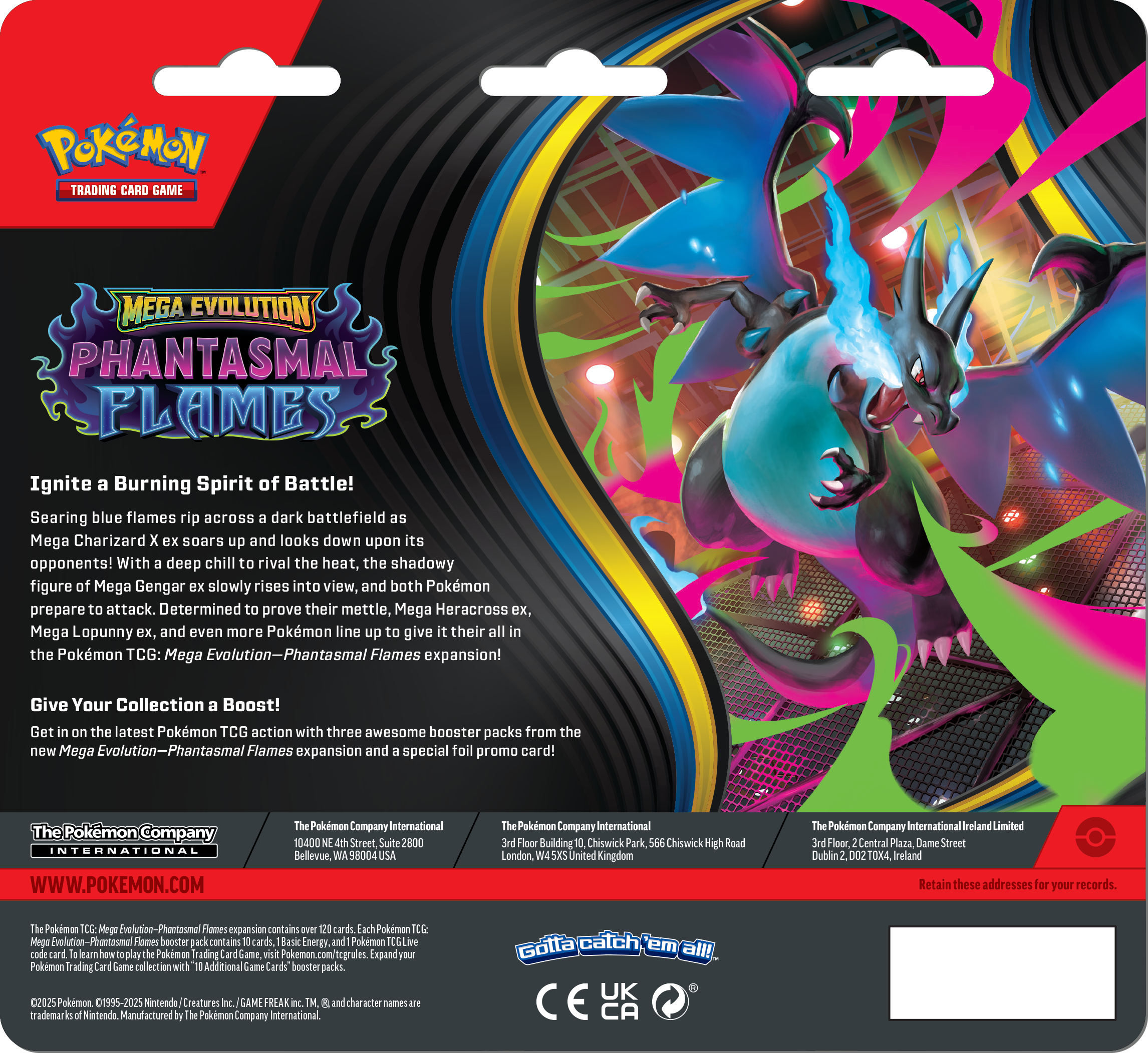 Brandende blauwe vlammen scheuren over een donker slagveld terwijl Mega Charizard X EX omhoog vliegt en neerkijkt op zijn tegenstanders! Met een diepe kou die de hitte evenaart, komt de schaduwachtige figuur van Mega Gengar EX langzaam in beeld, en beide Pokémon bereiden zich voor op de aanval. Vastbesloten om hun moed te bewijzen, staan ​​Mega Heracross ex, Mega Lopunny ex en nog meer Pokémon klaar om alles te geven in de Pokémon TCG: Mega Evolution—Phantasmal Flames-uitbreiding!