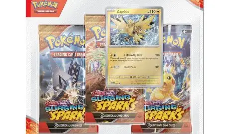 Met de Pokémon Scarlet & Violet – Surging Sparks 3 Pack Blister Zapdos (SV08) geef jij jouw verzameling een boost!